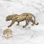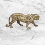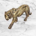 Brass-colored tiger figurine with stripes, and it is meant to be a Feng Shui decorative piece 6 Inch