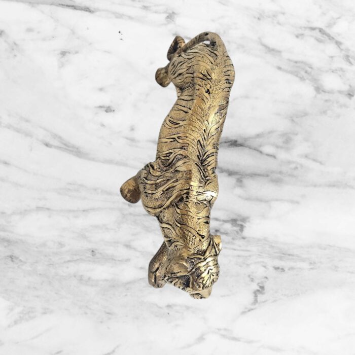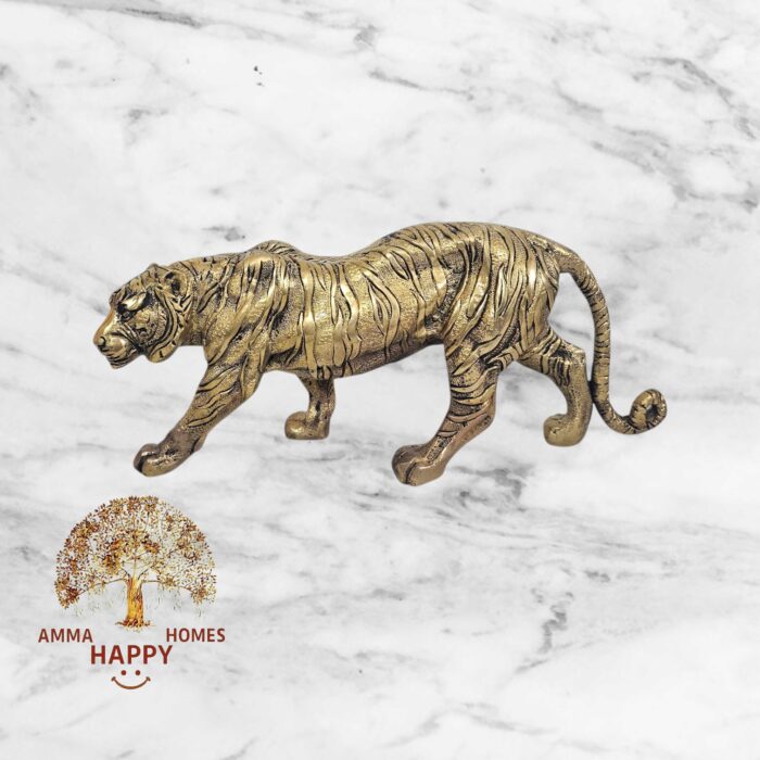 Brass-colored tiger figurine with stripes, and it is meant to be a Feng Shui decorative piece 6 Inch